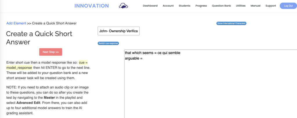 It only takes a few minutes to select words and phrases from the student’s work submission that I believe they do not likely know. I select seven to ten words or phrases and I generate a short answer translation quiz using Innovation’s Quick Short Answer.
