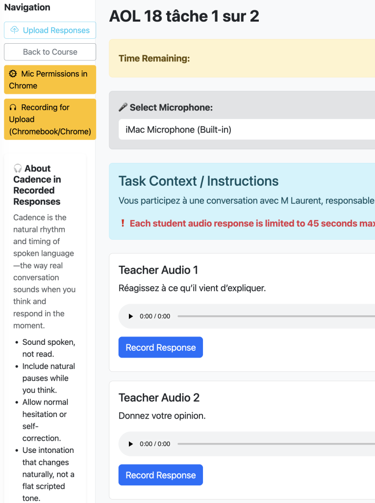 A teacher begins by configuring the task. The setup is intentionally straightforward: give the task a title, add context or directions, set an overall time limit, and decide whether each prompt response should also have its own time cap. That matters in speaking assessment, because sometimes you want students to think and answer naturally, not rehearse for several minutes. Teachers can also decide how students will complete the task. There is a browser-recording version for direct in-app speaking, and there is also an upload version for cases where device compatibility or student circumstances make recording in-browser less reliable. If a teacher wants tighter control, the task can require in-browser recording so response timing is enforced more strictly.